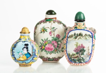 | Lot #: 27 Three Porcelain & Enameled Snuff Bottles |
