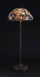 Floral motifs were characteristic in many Tiffany Studio lamps. The glass used in the shades was often vivid in color with unique textures, resembling flowers and other natural elements. Bases often matched the shades, with wood or tree trunk-esqe styling being extremely popular.