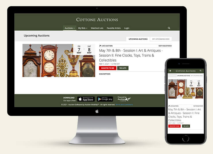Our Cottone Live digital platform lets you bid on antiques in real-time from your computer or mobile device. Visit live.cottoneauctions.com or download our mobile app.