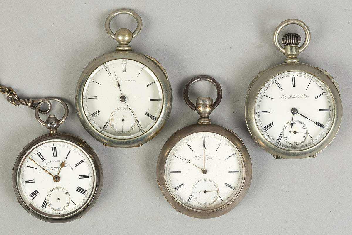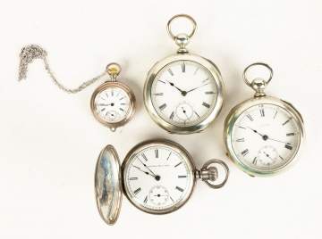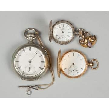 Group of Coin Silver and Gold Filled Pocket Watches, Dials & Cases