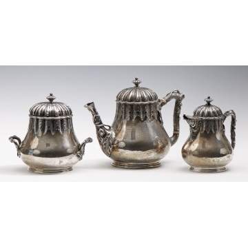 | Hand chased & fluted top, naturalistic handle. All sgn. Tiffany & Co., 550 Broadway, NY, G10015. Sugar 21.3 Troy ozs., Teapot 35.4 Troy ozs. & Creamer 15.3 Troy ozs. Some small dents otherwise very good. All 3 faintly monogrammed. Max. ht. 8" Est. $2,000-$3,000 |