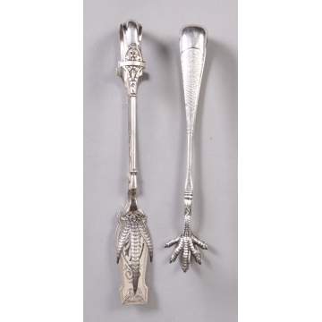 | L - Pastry server tongs, 11", 4.9 Troy ozs. & R - Double claw chicken tongs, 'W' in triangle mark, 9 1/2", 4.4 oz. Excellent. Est. $200-$400 |