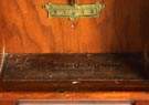 | Walnut case with nice old finish, possibly original. Minor repair to case. Good, clean, original painted dial. 8 day time only weight driven brass movement with second bit hand. Original label. |