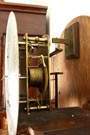 | Figured mahogany case. Silvered dial. 8 day weight driven brass movement. |