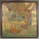 | Colonial Nathaniel Rochester, Seneca Tribe & General Sullivan O/C. "In the fall of 1800 the Valley of the Genesee is seen for the first time by the man whose name it's chief city now bears - Colonel Nathaniel Rochester." "The Seneca Tribe of the Iriquois Confederacy lived throughout this region as statesmen & warriors they are without peer in Aboriginal America." "General Sullivan's punitive expedition against the six nations in 1779 opens the Genesee country to agriculture." Some creases, paint loss & touch up. 6' x 6' . Est. $1,000-$1,500 |
