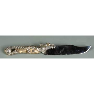 | 72. Gorham Sterling Knife, With a sea creature grasping a fish. 10. oz. L 12 1/2" Est. $1,500-$2,500 |