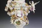 | Intricately decorated w/figures, insects, flowers, cherubs, crowns, gold leaf, etc. Made to commemorate a member of the Saxon royal house; portrait and coat of arms probably represent Carola von Vasa (1833-1907), Princess of Sweden and Queen of saxony. She and her husband, King Albert (1828-1902) often gave Meissen objects as diplomatic gifts. |
