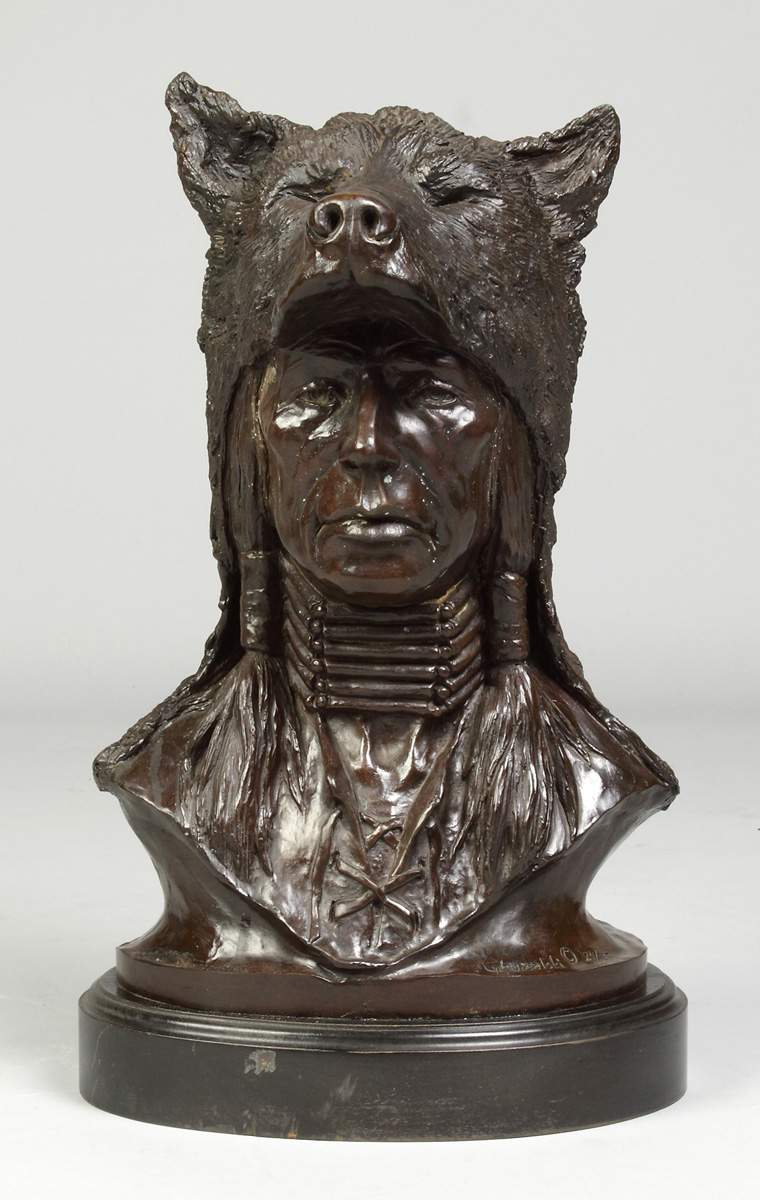 James Gruzalski (American, 1938) Bronze sculpture of an Indian chief wearing a bear headdress