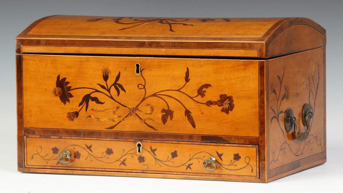 | Lot #: 697 Satinwood, Mahogany & Ebony Inlaid Dome Box w/Drawer |