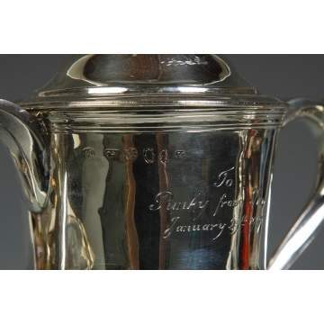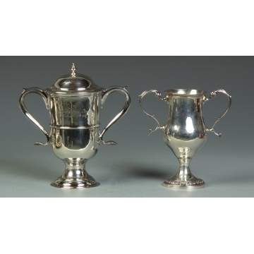 | 79. 2 Early Silver Chalices, L: Early Covered Silver Chalice, Hallmark CB, probably Cornelius Bland. Ht. 9" W 8". R: Sterling Chalice w/Handles, Hallmark IL. Inscribed on underside. Ht. 7" W 7". Total 19 oz. Est. $500-$800 |