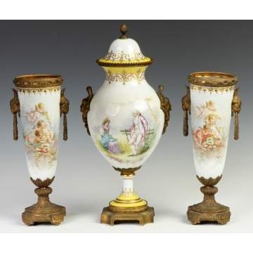 | Lot #: 363 French Sevres Style Hand Painted Porcelain Garnitures & Covered Urn |