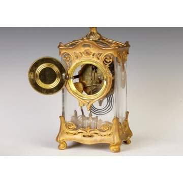 | Gilt bronze case with original patina & molded glass. Porcelain dial, outside escapement. Mercury pendulum. 8 day time & strike movement. |