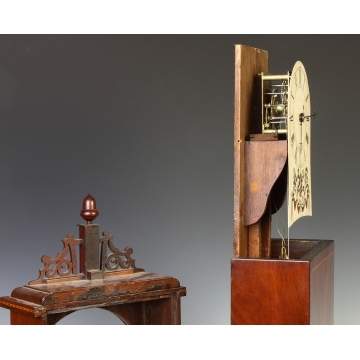 | C. 1790. Mahogany case. Original painted iron dial, old overpaint. 30 hour time only weight driven brass movement. |