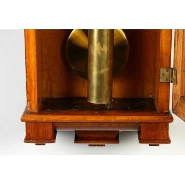 | Oak case; old, possibly original finish. Nice & clean original painted metal dial. 8 day time only weight driven brass movement. Good label. A nice example. |