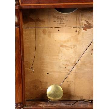 | Mahogany case, turned columns, claw & paw feet, carved fruit basket crest, old patina. Original painted wood dial, some over-varnish. Bottom glass professionally repainted. 8 day time & strike weight driven brass movement. Nice label. |