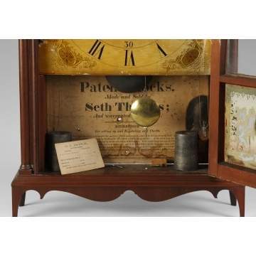 | Mahogany case, old finish & patina. Original finials.Original painted wood dial w/thin coat of old varnish. Original reverse painted tablet. 30 hour t/s weight driven wood works movement. Original lead weights & pendulum. Good clean label. A nice example. |