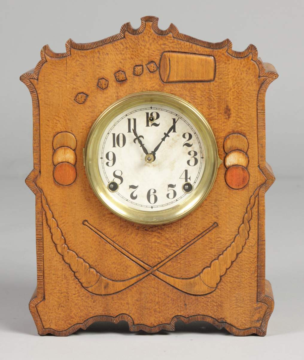 | Maple case w/pipes, dice, cards, etc. 8 day time & strike spring driven brass movement. Partial label on reverse: Cosey Corner R. Ht. 13 1/2" Est. $150-$300 |