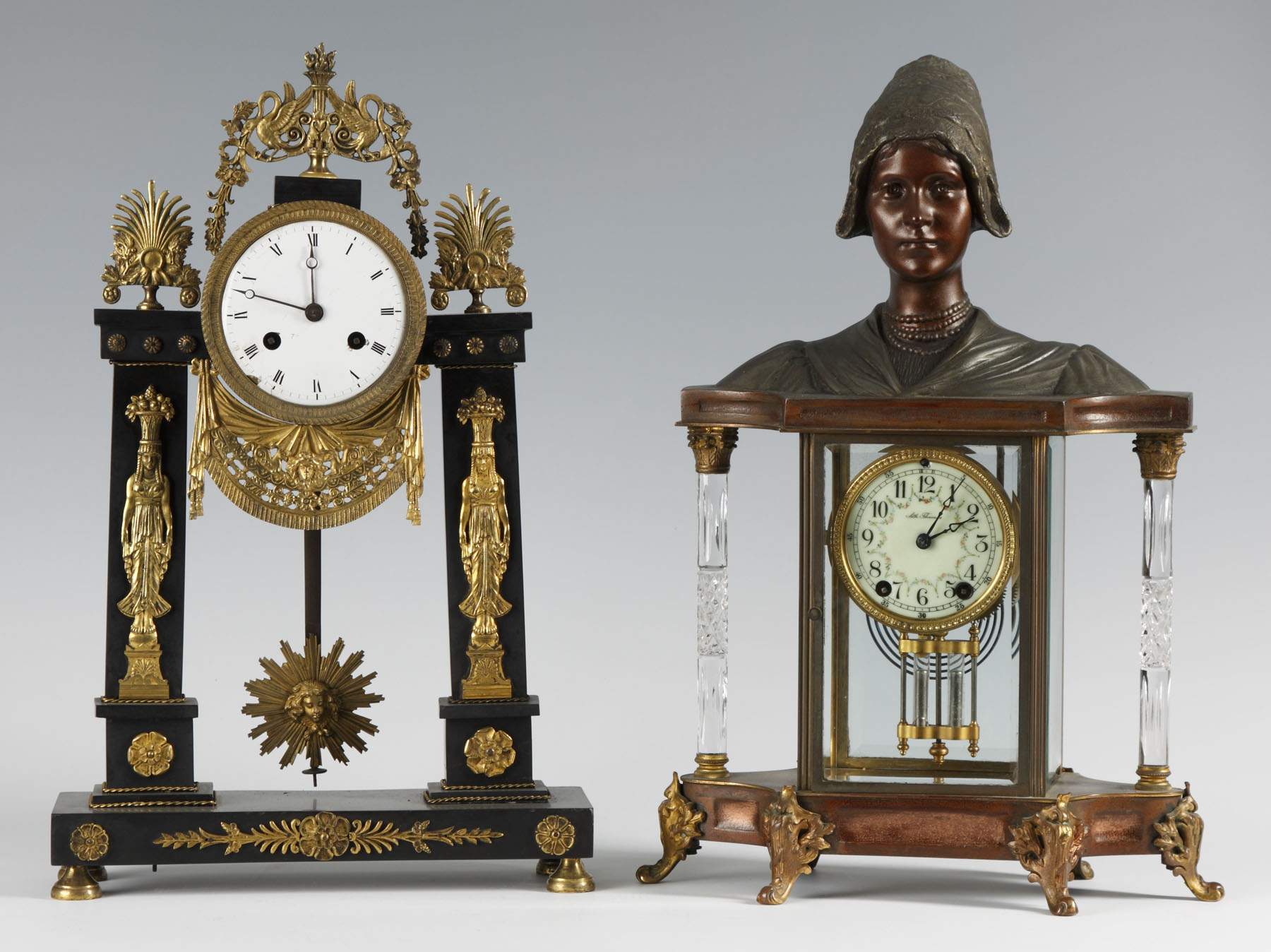 | Lot 133: L - Egyptian style. Porcelain dial, small chip & hairlines. T/s, missing bell. Star face pendulum. Ht. 20". Est. $600-$1,000 Lot 134: R - Patinated metal art Nouveau case, cut glass columns, beveled glass. Painted porcelain dial. Small chip near winding arbor.8 day t/s movement. Mercury style pendulum, break to one tube.Ht. 20". Est. $800-$1,200 |