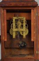| Mahogany case, old patina. Original painted wood dial, has been split. original reverse painted glass. 8 day time & strike spring driven brass movement. Springs encased in iron. Iron back plate. Ht. 18 1/2" Est. $700-$1,000 |