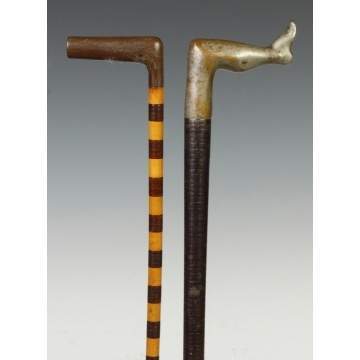 | Leather, wood & horn. Stacked leather w/plated brass lady's leg handle. |