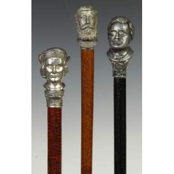 | L to R: 1893, Columbus Exposition, Chicago, silver plate, missing ferrule, grain painted shaft. Frederick the Third, indentations in head. Free, Courage & Prosperity. |