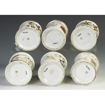 | L to R: T & V Limoges, some wear to gold, otherwise very good. Wear to gold, otherwise very good. T & V Limoges, minor wear to gold, otherwise very good. T & V Limoges, some wear to gold, otherwise very good. KPM, minor wear to gold, otherwise very good. T & V Limoges, wear to gold, otherwise very good. |