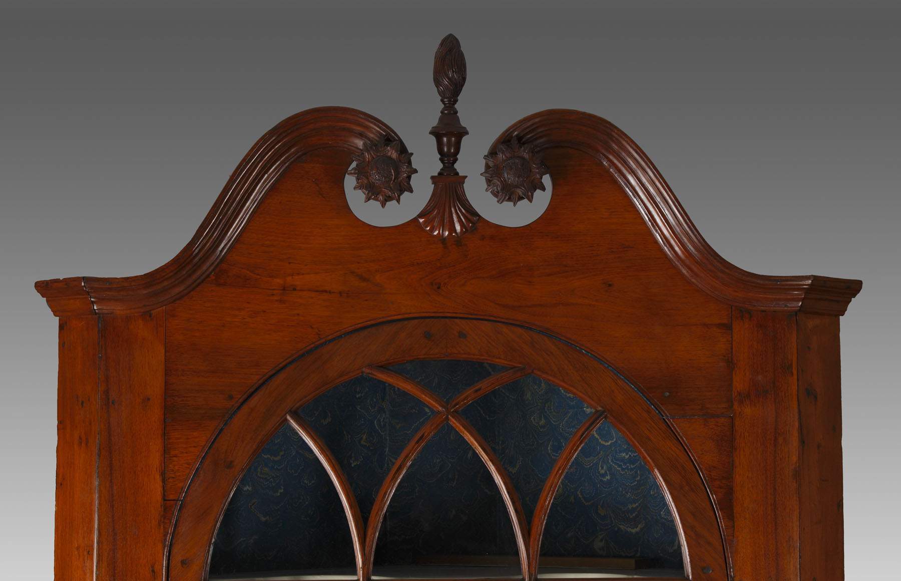 | Walnut case w/deep rich patina, broken arch top, carved sunflower rosettes, flame finial, ogee bracket base. Raised panel doors. |
