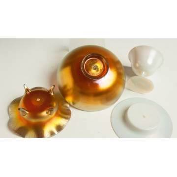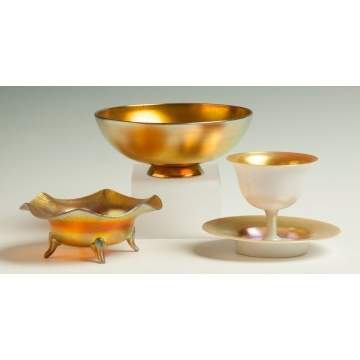 | Early 20th cent. Steuben footed dish w/ruffled top, Sgn. Aurene 130, Ht. 2 1/2" Dia. 6". Steuben bowl, Sgn. F. Carter Aurene 2852, Ht., 3" Dia. 7". Steuben calcite & gold iridescent sherbet & under tray. |