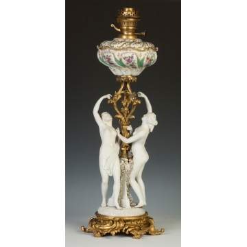 | Lot #: 434 French Porcelain & Gilt Bronze Oil Lamp with Classical Figures & Hand Painted Porcelain Tank |