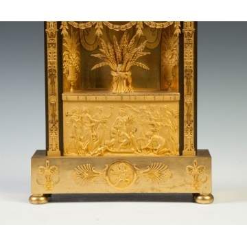 | C. 1790. Neo-Classical figures. Gilt bronze. Porcelain dial sgn. Revel, De Richelieu, small flakes to dial near winding arbor. 8 day time and strike movement. |