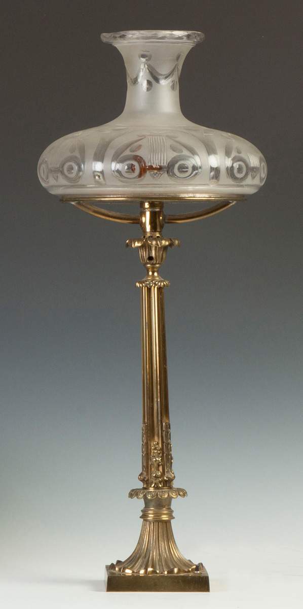 | Early 19th cent. Patinaed Brass. Original engraved & fire polished shade & donut tank. |