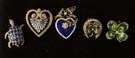 | 14K gold & diamond heart shaped pin/pendant, Ht. 1". Gold, enameled & pearl hear shaped pin/pendant, Ht. 1 3/8". 10K gold, enameled & pearl clover pin, Ht. 3/4". 14K gold, enameled & pearl clover pin, Ht. 7/8". |