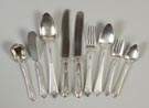 | 61 Pieces: 8 Dinner knives, 8 7/8"; 6 Dinner knives, 8 3/4"; 8 Dinner forks, 7 1/4"; 8 Salad forks, 5 7/8"; 12 Teaspoons, 5 3/4";6 Tablespoons, 7 3/8"; Butter knife, 7 7/8"; Sugar spoon, 6"; 2 Serving spoons, 8 1/2"; 9 Assorted teaspoons (non-matching), 5 3/4"; Monogrammed. 45 ozt. Weighable. |