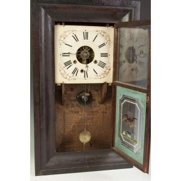 | Mahogany case, original finish. Original painted wood dial. Original reverse painted tablet with eagle & cannon. 30 hour weight driven movement with alarm. |