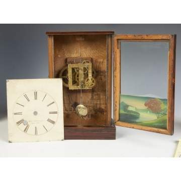 | Original grain painted case. Original signed & painted metal dia. Original reverse painted one-piece glass. 30 hour time only spring driven brass movement. |