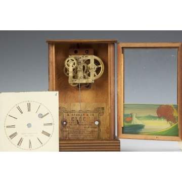 | Original grained case. Original signed & painted metal dial. Original reverse painted glass. 30 hour time only spring driven brass movement. |