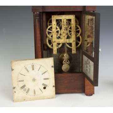 | Walnut & rosewood case; full columns & turned finials; original finish. Original signed & painted metal dial. Original etched glass. 8 day time & strike movement. |