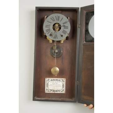 | Stenciled case, old surface. Original painted zinc dial. Original reverse painted glass. Period mirror. Brass time & strike movement. |