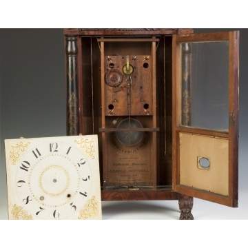 | Mahogany case, original stenciling, carved eagle & claw feet. Original painted wood dial. Original reverse painted tablet, loss. 30 hour time & strike weight driven wood works movement. |