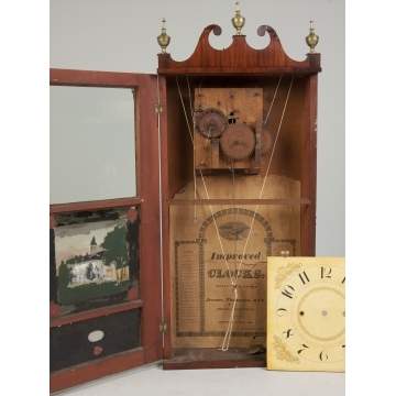 | Mahogany case, old finish. Fluted pilasters with carved capitals, original finials. Original painted wood dial. Original reverse painted tablets. 30 hour time and strike weight driven movement. |