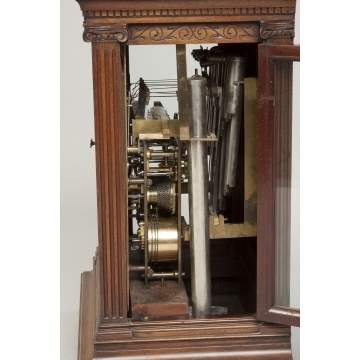 | C. 1900. Mahogany case with fluted & carved capitols. Brass filigreed dial & numbers, silvered chapter ring. Three train fusee movement with tubular chimes. |