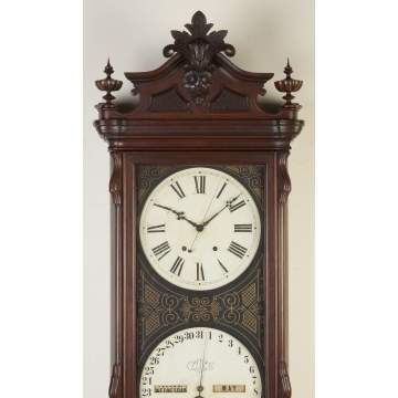 | Walnut case, original finish. Original paper over metal dials. 8 day time & strike, two weight, nickel plated movement with perpetual calendar and sweep second hand. Original nickel plated pendulum. Serial number 3993 written in pencil on the frame under the dial, as well as 11-'88. An outstanding example, the best one we've ever seen. |