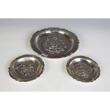 | Larger: coat of arms; makers mark E.V; Dia. 13". Smaller: double headed eagle, makers mark A.C., Dia. 7 1/2". 27.7 ozt. |