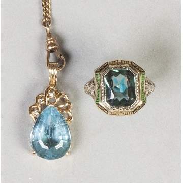 | Necklace, aquamarine & diamond chips, Ht. 1 1/2". Ring, marked France. |