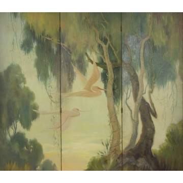 | Lot #: 383 Eugene Dyczkowski (American, 1899-1987) Three Panel Folding Screen "Pink Roseate Spoonbills" |
