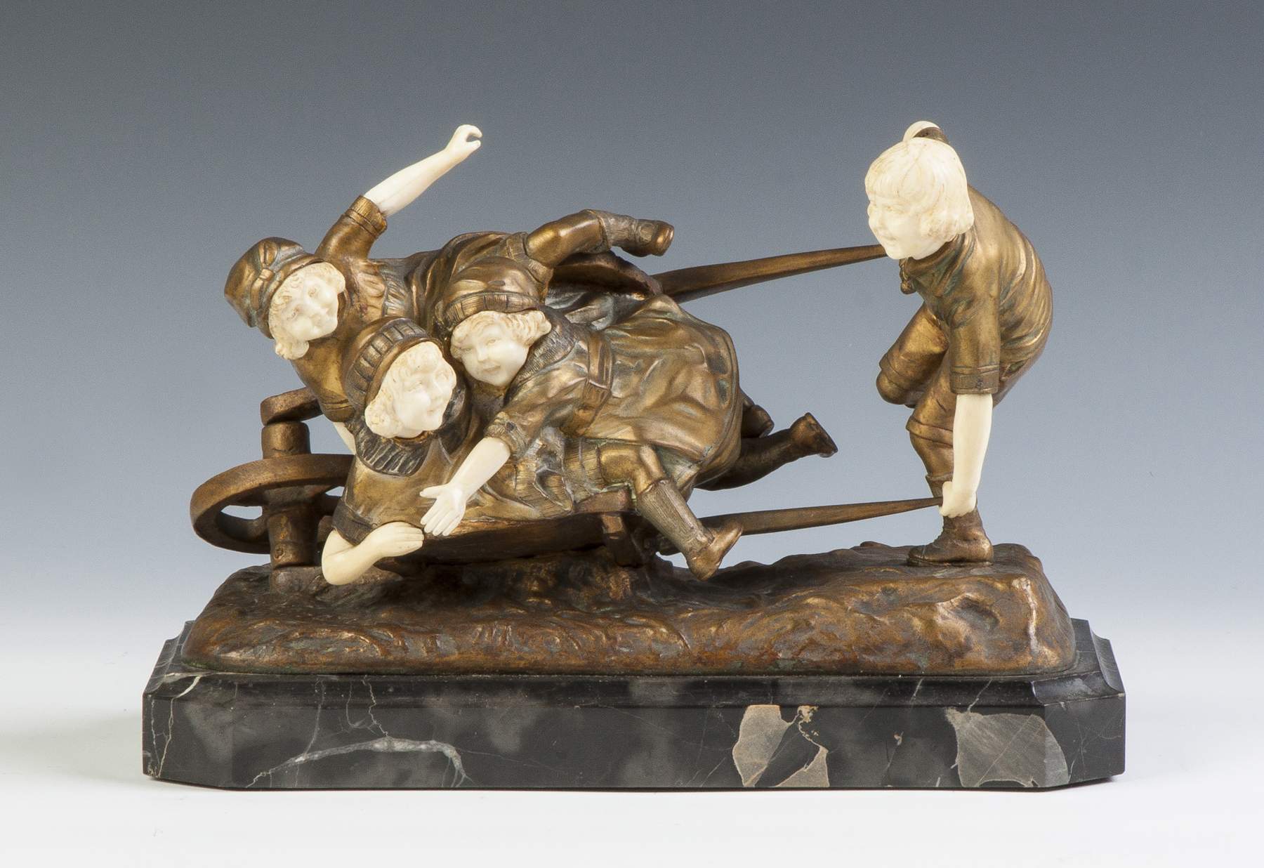 Dimitri Chiparus (Romanian, 1886-1947) Gilt Bronze & Ivory Sculpture of Children in a Wheelbarrow