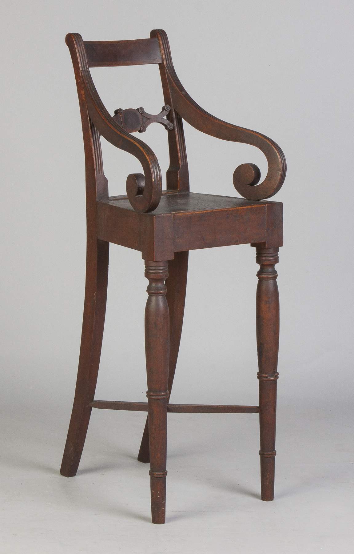 | Early 19th cent. Walnut; scroll & reeded arms; turned legs, stretcher base. |