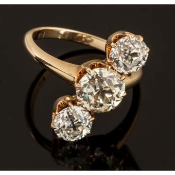 | Three old European cut diamonds. All weights, color & clarity are mounted, approximates. Center diamond: 1.83cts. Diameter, 7.52 to 7.67mm. Depth, 5.05mm. Clarity VVS1. Color K, with slight blue fluorescence. Two minor chips under prongs. Two side diamonds: Total 1.8cts. Dia. 6-6.1mm. Clarity SI1. Color I, slight blue fluorescence. |