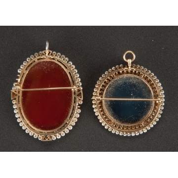 | L: 14K gold, diamonds, Missing 3 seed pearls, Ht. 1 5/8" W 1 1/4". R: 14K gold, Dia. 1 1/4", Missing one seed pearl. |