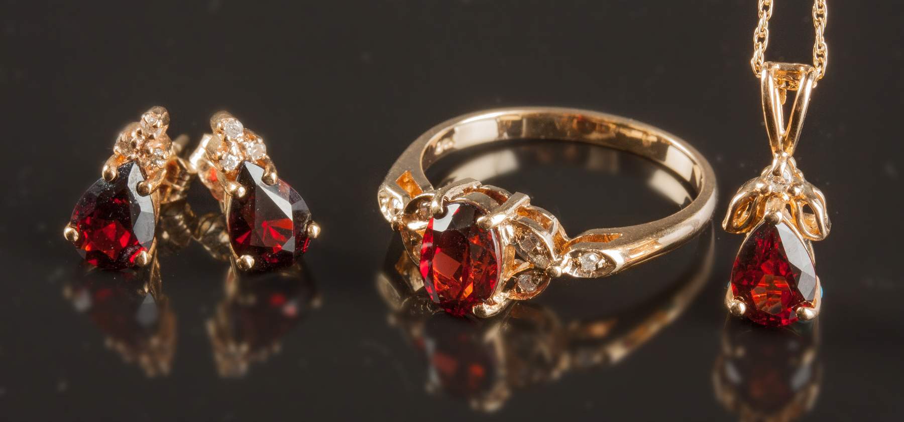 | L to R: 14k gold pear shaped garnet & diamond earrings. 10k gold, garnet (7 x 5mm) & diamond ring. 14k gold pear shaped garnet pendant (5 x 6mm). |